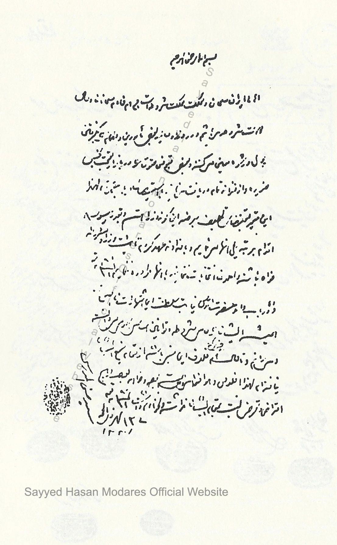 A letter from Sayyed Hassan Modares to the Parliament regarding legal action against the authorities and officials who accept bribes and perform illegal and unconstitutional engagements.